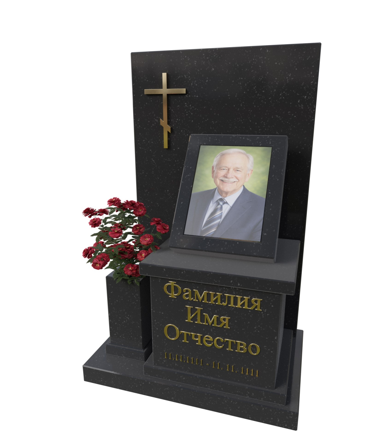 Эта модель выделяется своей архитектурной выразительностью. Высокая стела придает колумбарию монументальность, нижняя гранитная камера под одну урну сохраняет визуальный баланс, а боковой цветочный блок делает композицию живой и теплой. Золотое оформление имени и дат подчеркивает индивидуальность мемориала и усиливает ощущение элитного исполнения.