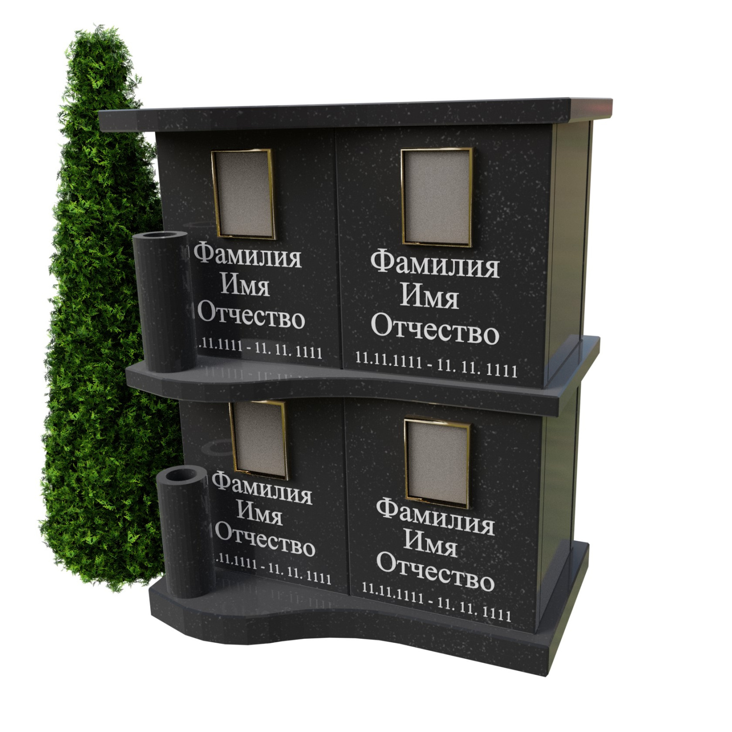 Модель имеет отдельные зоны под фото и памятные надписи, что позволяет персонализировать каждую секцию. Встроенные элементы для цветов добавляют композиции завершенность, а темное исполнение подчеркивает строгость и благородство формы.